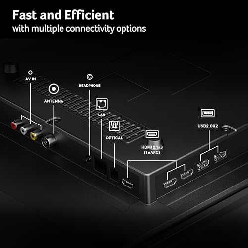 Connectivity: Dual band Wifi | 2-Way Bluetooth 5.0 | AV, RF, Ethernet, headphone×1 | HDMI Ports 2.0 x 3 to connect personal computer, laptop, set top box, gaming console | USB 2.0×2 to connect hard drives or other USB device