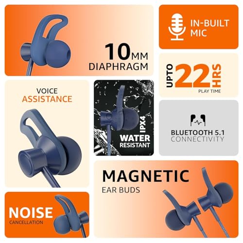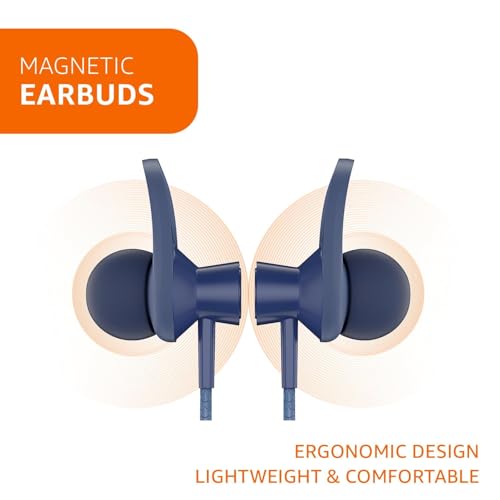 amazon basics in-Ear Wireless Neckband with Mic, Up to 22 Hours Play Time, Bluetooth 5.1, Voice Assistance, Noise Cancellation, IPX4 Water-Resistance, Magnetic Earbuds (Blue)