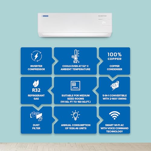Blue Star 1.5 Ton 3 Star Wi-Fi Inverter Smart Split AC (Copper, 5 in 1 Convertible Cooling, 4-Way Swing, Turbo Cool, Voice Command, IC318YNUS, White)