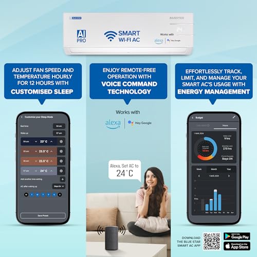 Smart AC with Smart App: Blue Star Smart AC comes with an in-built Wifi module which ensures that you can use your AC from anytime, anywhere, truly the smart way. Voice Command Technology: Operate your AC with Voice Command using Amazon Alexa or Google Assistant. Switch On, set the temperature and enjoy comfort cooling through Voice Command Assistants.
