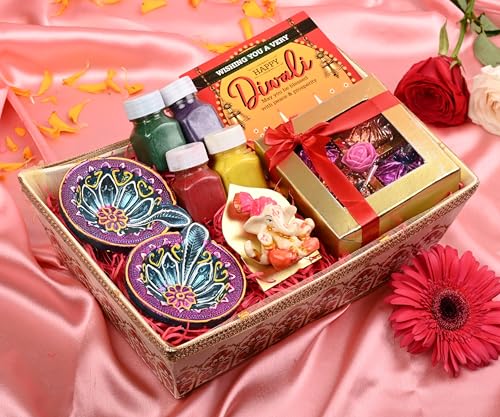 Diwali gifts for family and friends/diwali gift hamper/diwali gifts-Handcrafted chocolates in a box+2 earthern diyas+4 jars of rangoli colours+Ganesha idol+deepawali greeting card