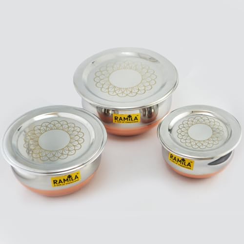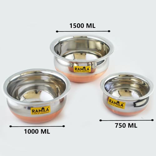 ramila Brand Stainless Steel Handi Set with Lid – Cookware Set for Serving and Cooking in The Kitchen, Copper Bottom Vessels for Induction (750ML, 1000ML, 1500ML), Multicolor