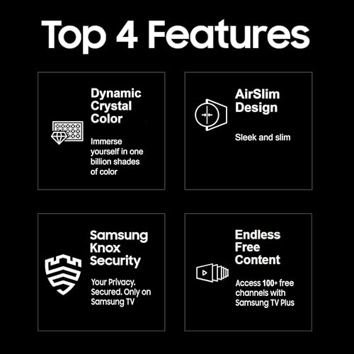 Display: Dynamic Crystal Color with one billion shades of color | Crystal Processor 4K Picture Engine | HDR 10+ Support | 4K Upscaling | HLG (Hybrid Log Gamma) | Mega Contrast | UHD Dimming | Contrast Enhancer | Motion Xcelerator | Film Mode | HDMI Black Level