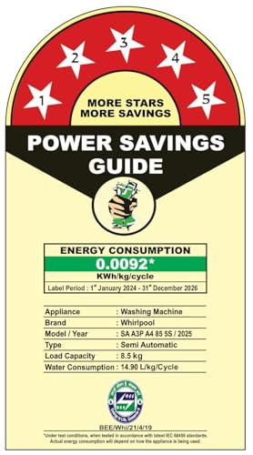 Energy Rating 5 Star: Best in class efficiency | Energy consumption – 0.0092* KWh/kg/cycle (Please refer BEE label for more information), Model/Year : SA A3P A4 85 5S/2025