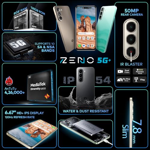 ZENO 5G AI Smartphone | 8GB RAM 128GB ROM | IP54 Rated for Dust & Water Resistance | D6300 5G Processor | 6.7″ HD+ 120Hz Punch-Hole Display | 50MP Camera | 5-Year Fluency | Shadow Black